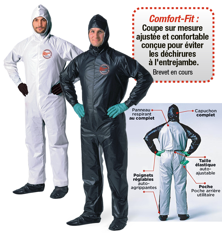 COUVRENT TOUT LE CORPS, DE LA TÊTE AUX PIEDS, AVEC DU NYLON NON PELUCHEUX, ET DU POLY/COTON RESPIRANT LUSTRÉ SUR LE DOS ET LA CAPUCHE.